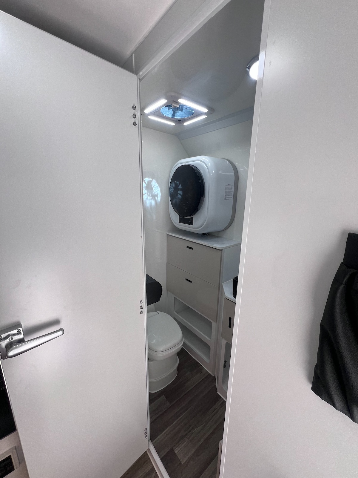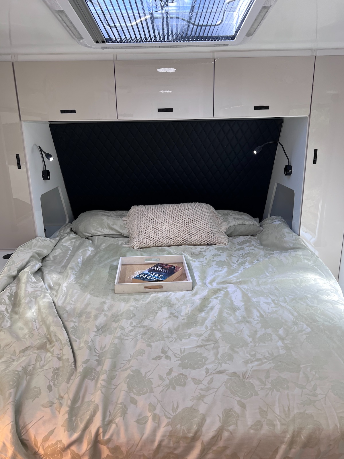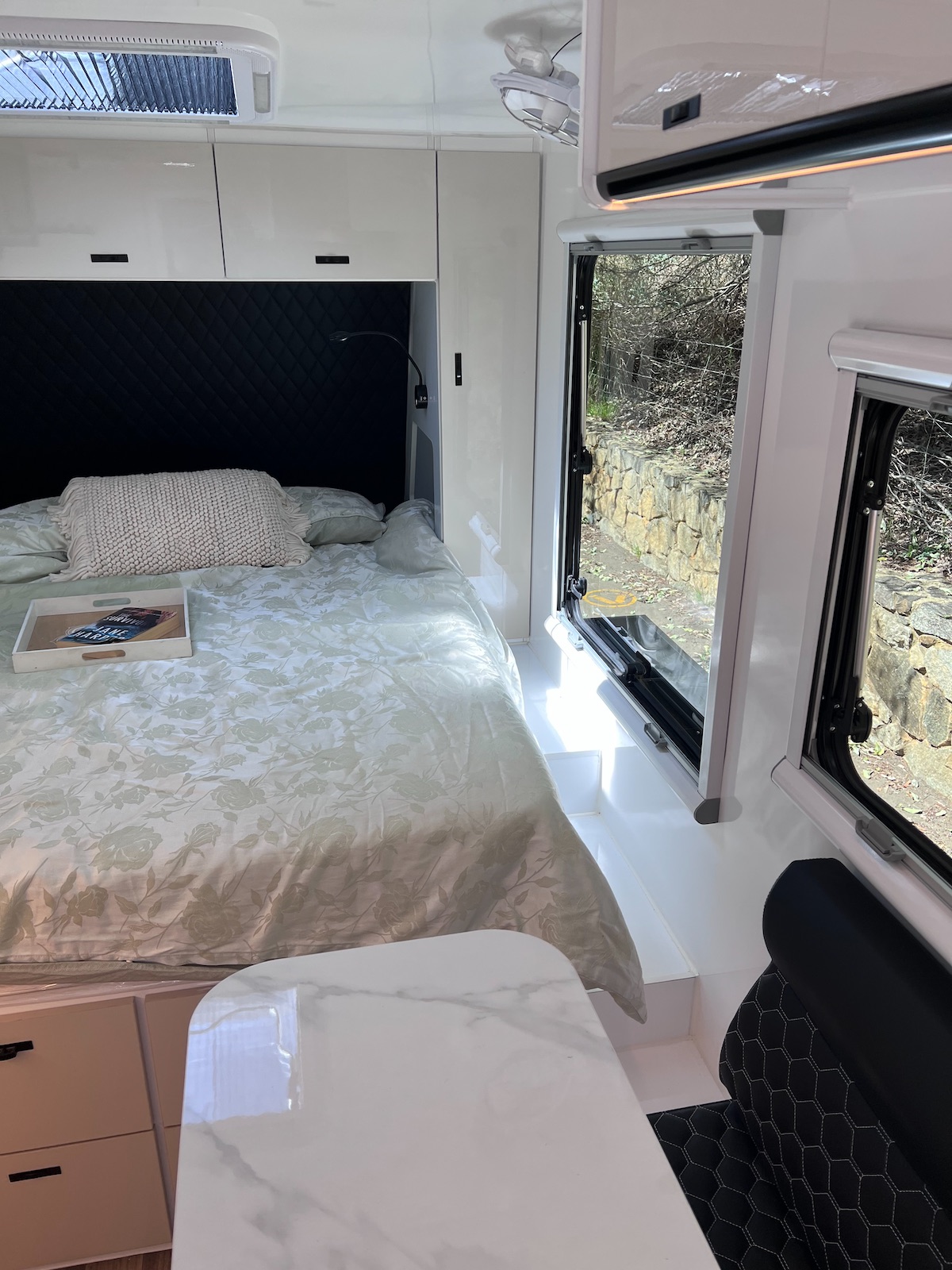 Step inside and discover a thoughtfully designed interior built for two. A spacious ensuite includes a Thetford toilet, shower, and hot water system, while the pocket-spring queen mattress with memory foam topper ensures restful nights.